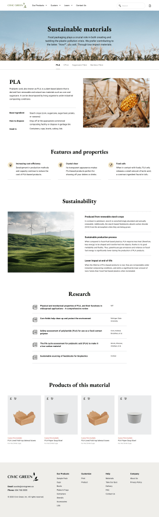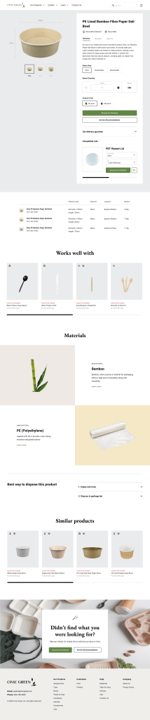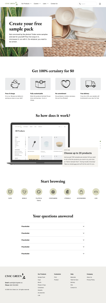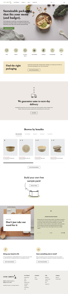 Civic Green is an environmentally friendly food packaging supplier that provides a diverse selection of fully recyclable and compostable packaging products. To better engage and connect with eco-conscious restaurateurs, Civic Green decided to collaborate with us in redesigning its digital presence. Together, we humanized Civic Green’s online experience to facilitate customers through their decision-making process, making it easy for them to confidently choose the products that meet their needs.