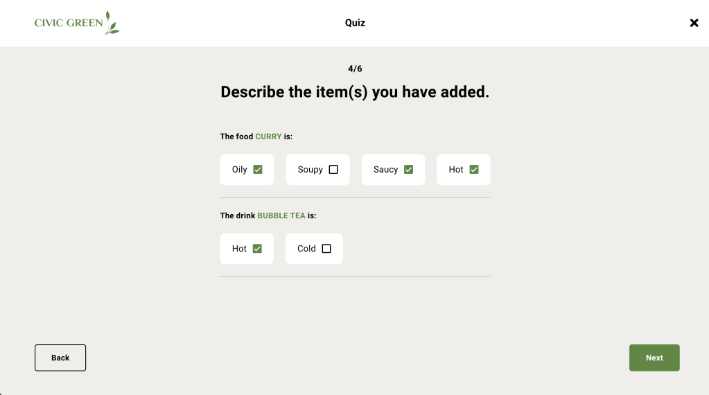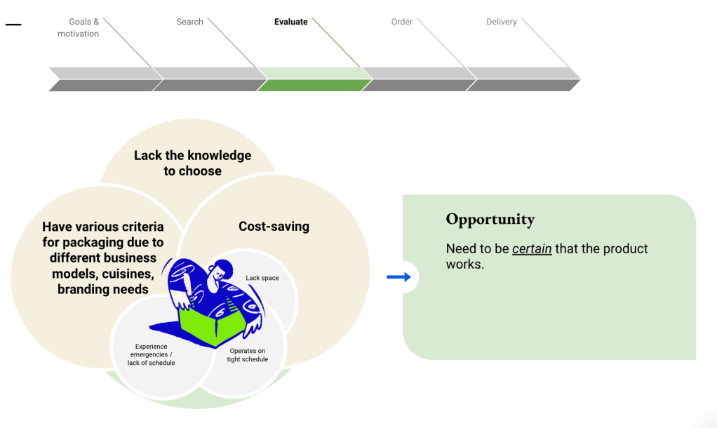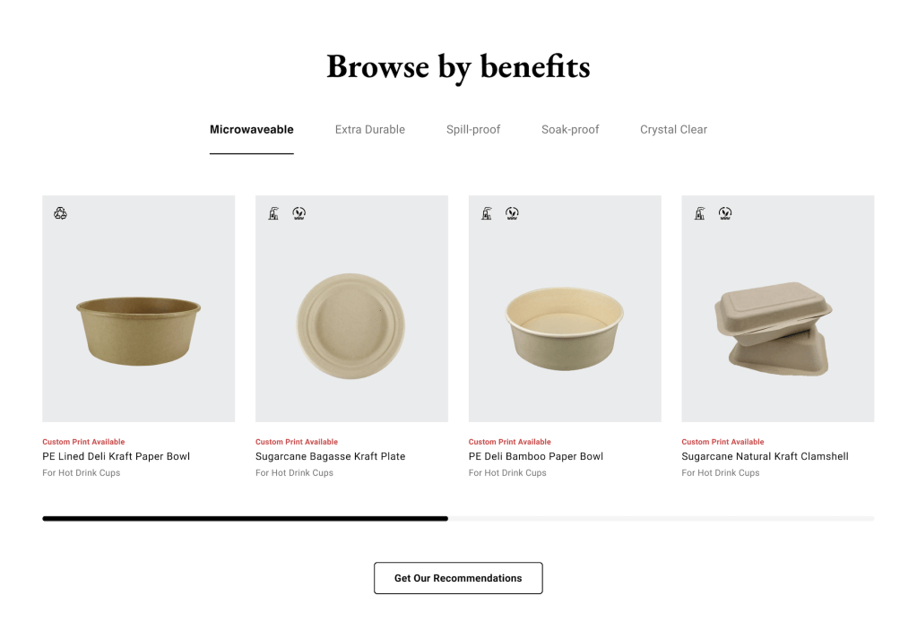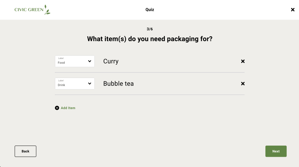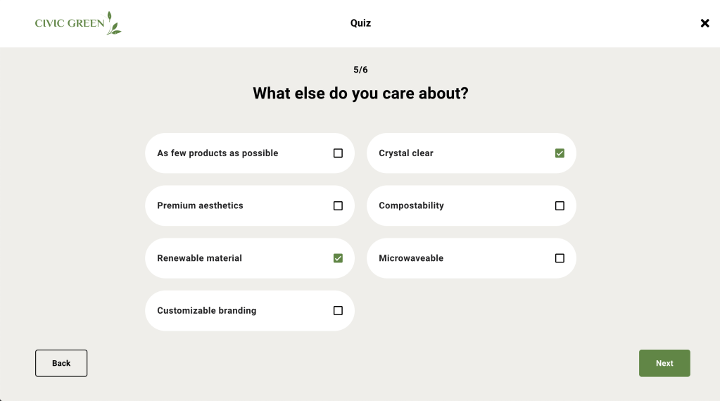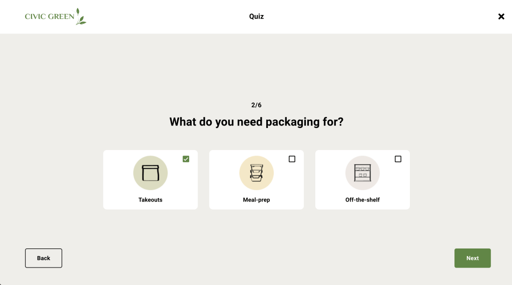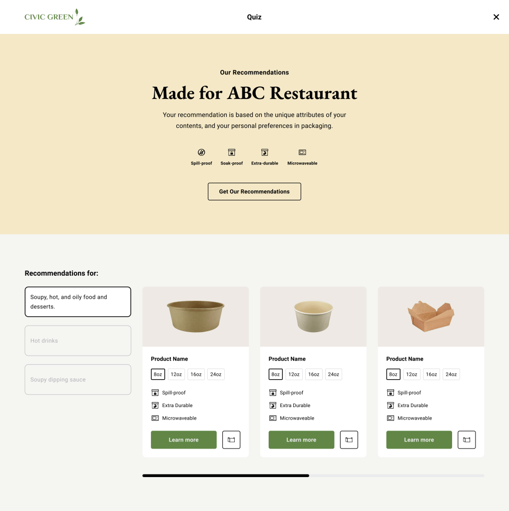 We identified two key barriers eco-conscious restaurateurs face in the process of selecting the right products: 1) the complex set of criteria for the needed packaging, and 2) a lack of knowledge about the different environmentally friendly materials and options. To provide relevant recommendations that direct users to the best options that meet their complex needs, and expedite the awareness and evaluation stages of their shopping experience, we created a 6-question quiz that leverages the customers’ familiarity with the foods and beverages they provide.