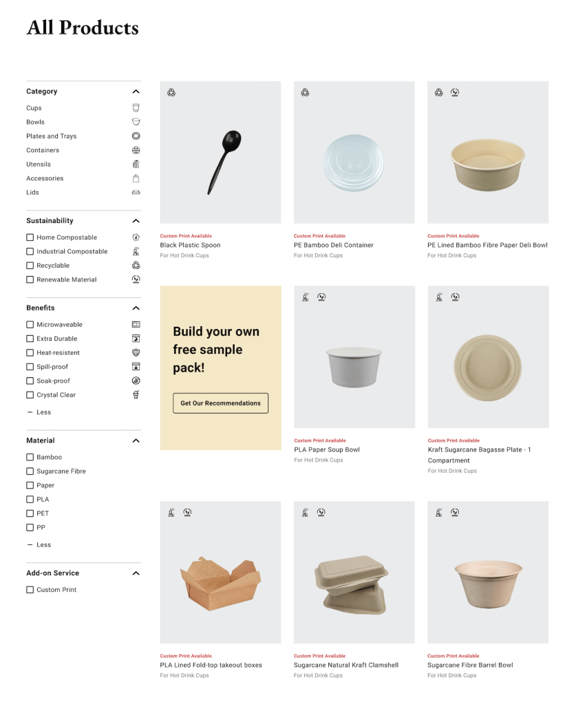 To ensure the search and selection process is hassle-free, relevant, and engaging for customers, we created a product filter and categorization system using nomenclatures reflective of user goals. For example, one filter category lists out the different levels of environmentally friendliness that customers may look to achieve through packaging products, while another reflects the performance criteria required based on the foods and beverages the customers provide. By allowing customers the flexibility to mix and match their environmental goals with performance goals, we not only address the key consideration factors in their selection process, leaving no room for uncertainty, but also directly lead the customers to the right product that helps them achieve both of their goals.