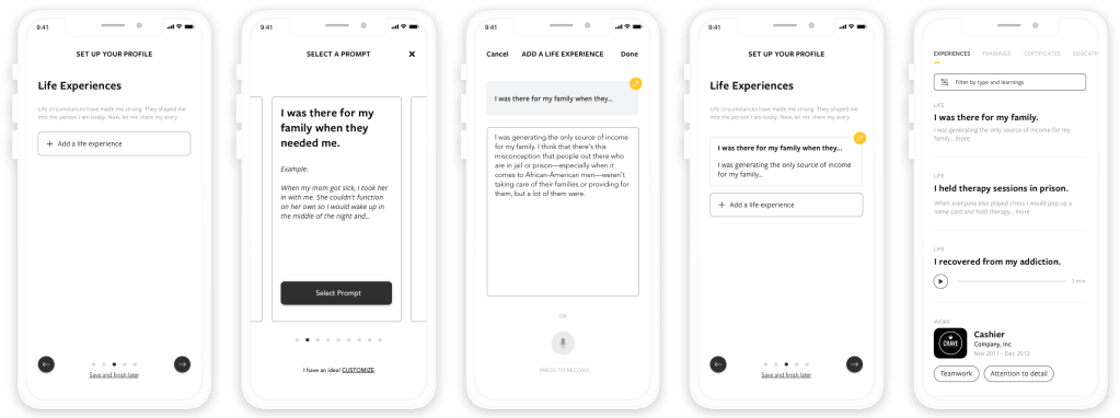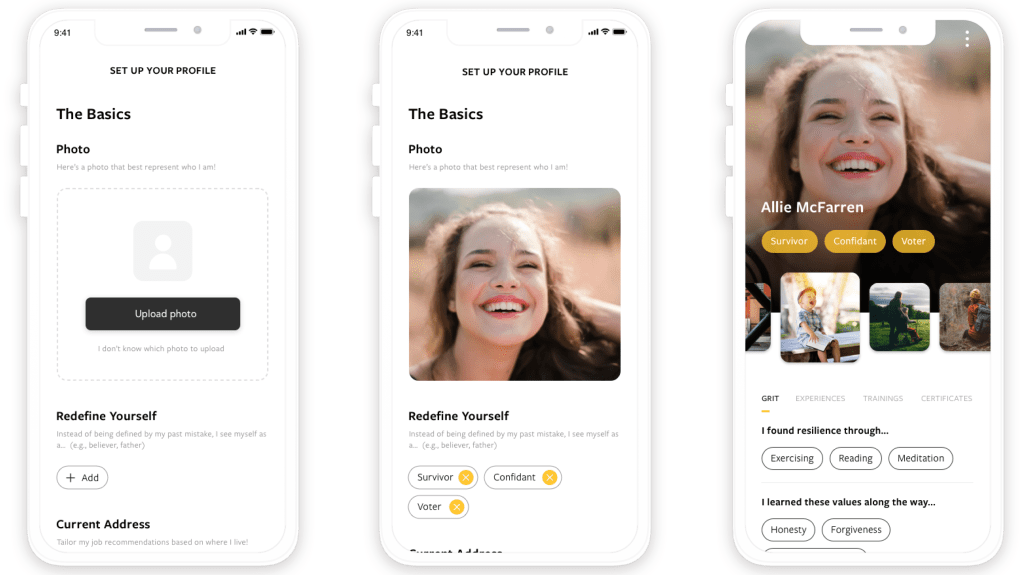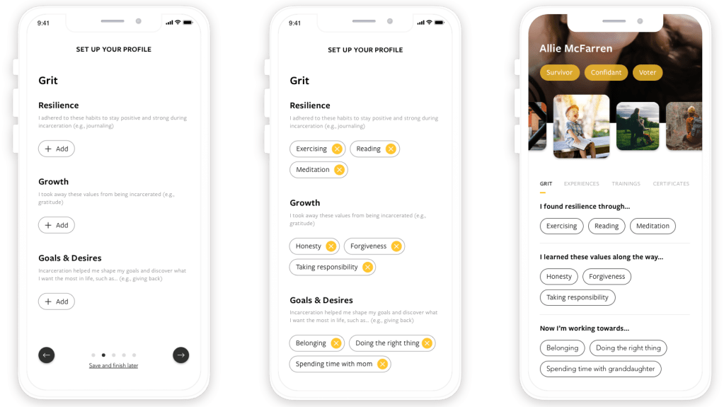 With the overarching goal of breaking the cycle of incarceration, we designed an app that allows the previously incarcerated to demonstrate their true selves and shared humanity during their job search, directly addressing employers’ tendency to dehumanize them based on their criminal record.