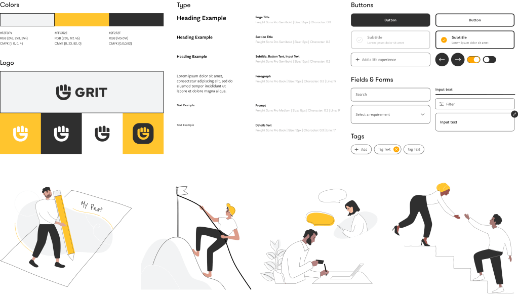 The brand color is a saturated yellow, associated with energy, joy and hope. Complementing it with different shades of grey, we kept it simple to avoid distracting users from their tasks or overwhelming them in an already intimidating process.