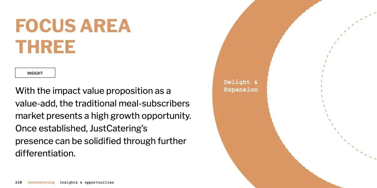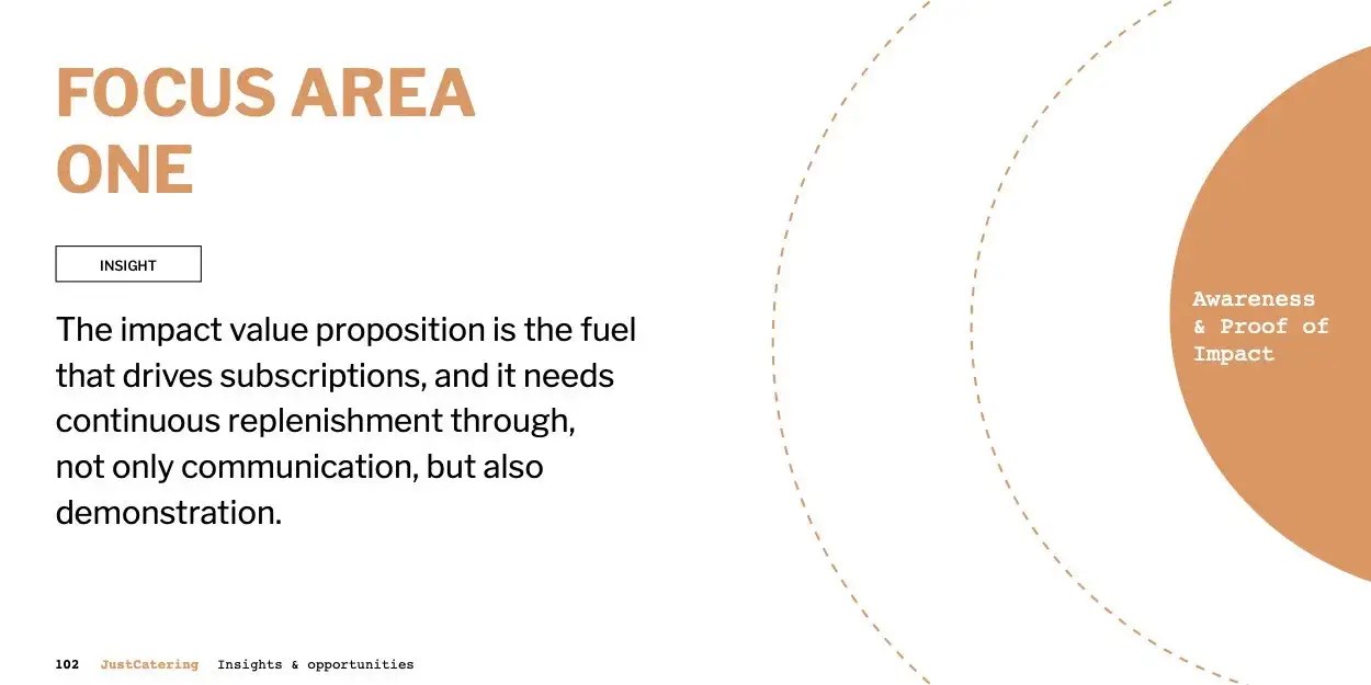 This deep understanding of the relative desirability and relevance of each business’s value propositions, as well as where the opportunities lie, provides us with a framework to evaluate the urgency and strategic value of the insights we uncovered from research. As a result, we were able to organize and prioritize our research learnings into three focus areas, each representing an insight. Together, these focus areas form a stepped-approach to growing revenue.