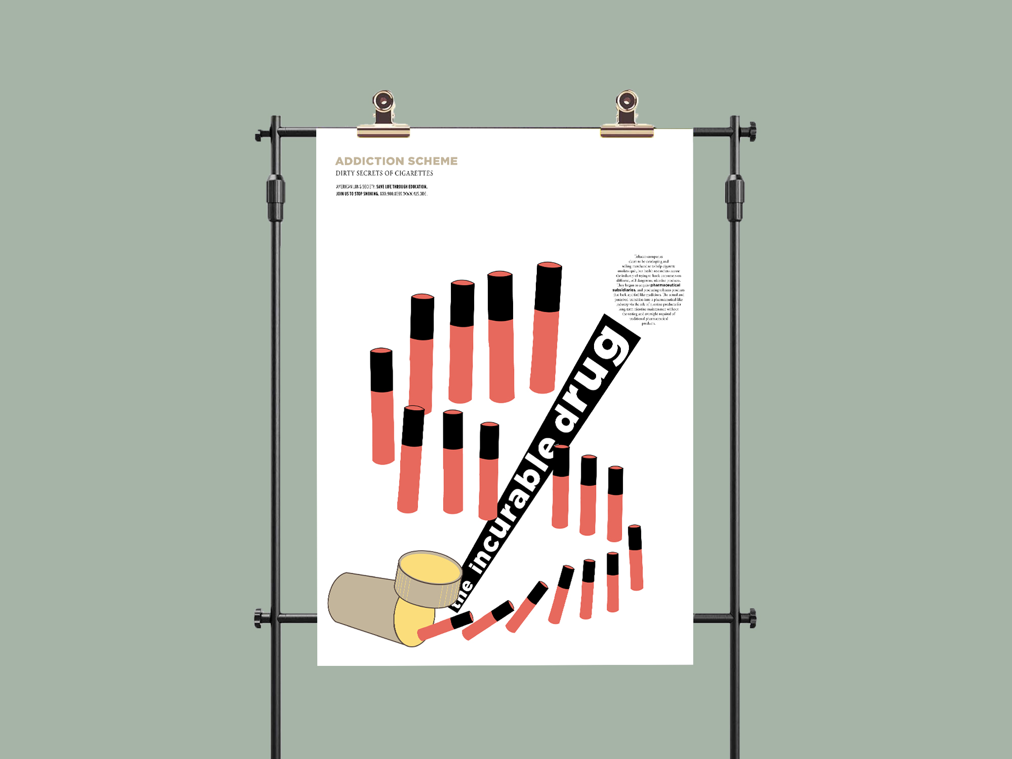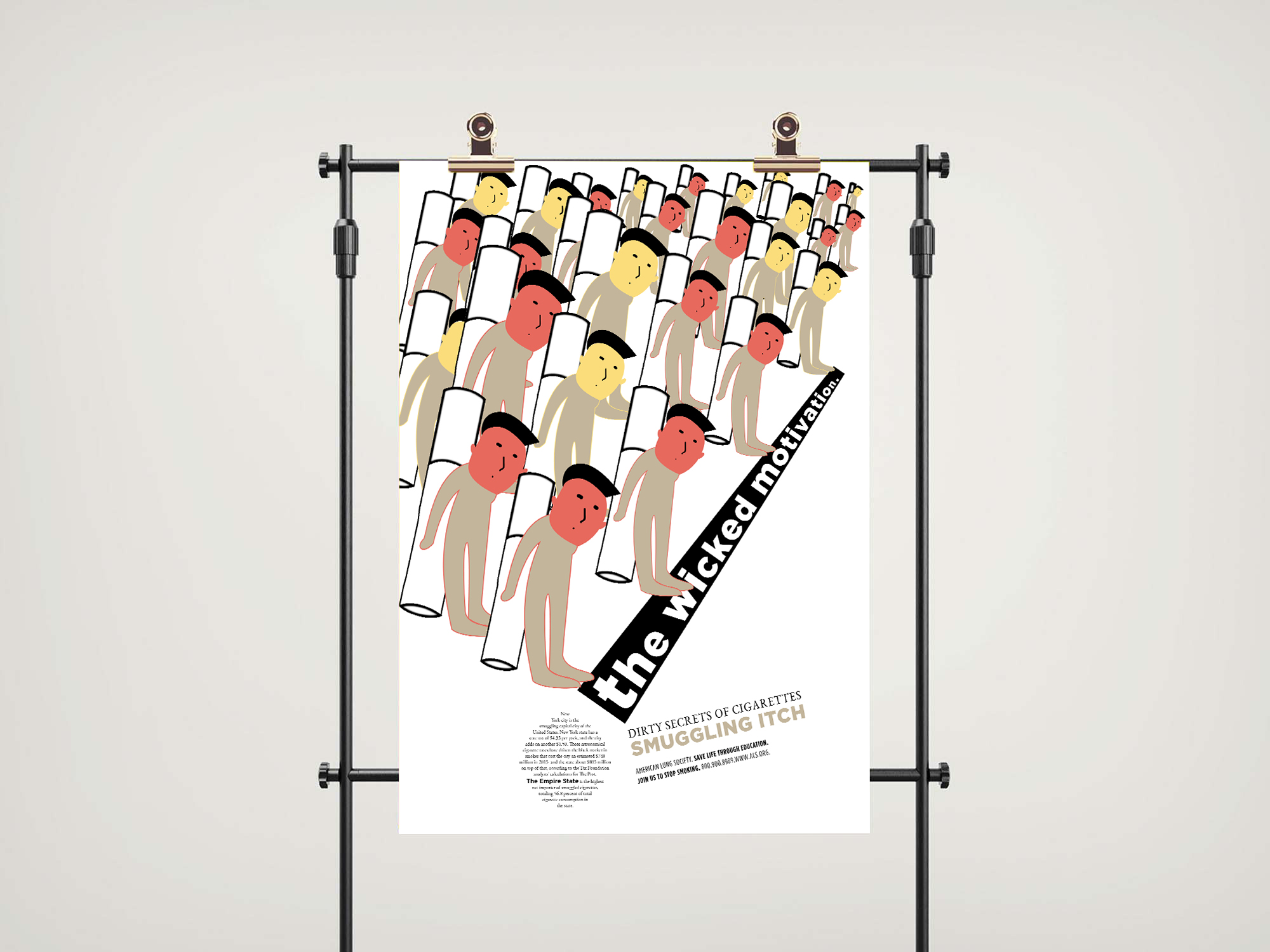 Our goal was to create a surrealistic graphic to illustrate the implications of smuggling cigarettes into different countries: Cigarettes are the owners, and we are the slaves.